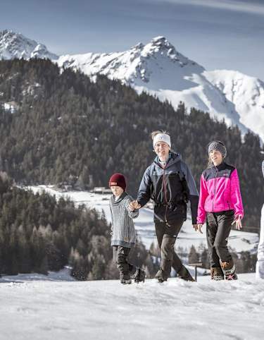 Winterwanderung von Nauders zum Novelleshof: Über den Wanderweg Nr. 18 marschiert man hinauf zum Novelleshof, wo ein herrlicher Ausblick auf Nauders und das Passtal Reschen die Mühen des Aufstiegs belohnt.
